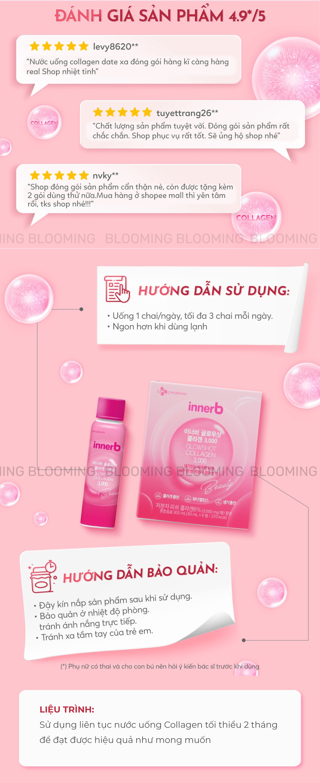 - Collagen hàm lượng cao 3,000mg dạng thủy phân từ vảy cá Bangladesh và Việt Nam giúp hấp thu tối đa và hiệu quả sâu cho da, mang lại làn da sáng mịn căng bóng đầy sức sống.